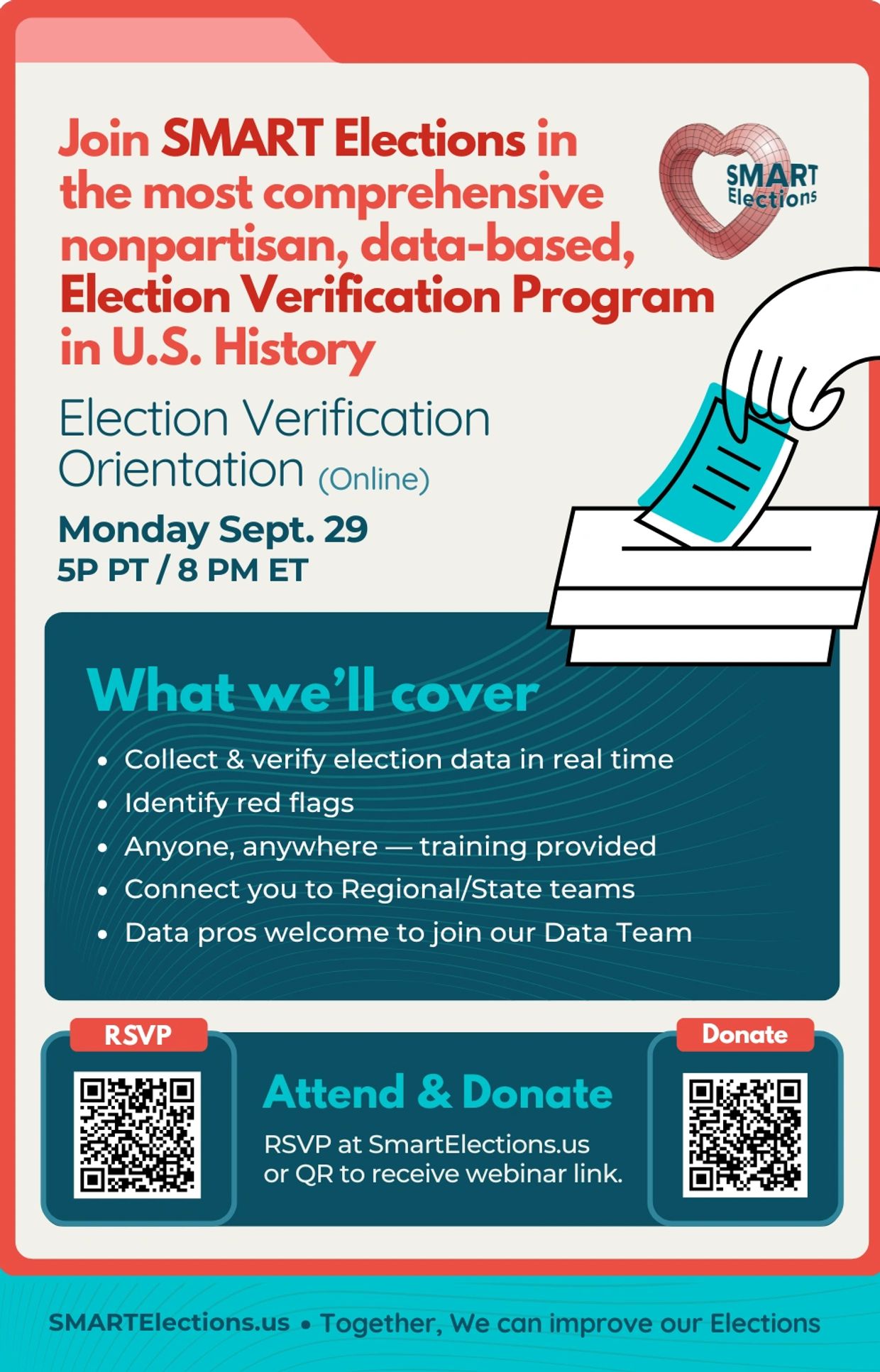 Join the SMART Legislation weekly Friday Action Meetings at 12pm ET most weeks. We work on legislation and lawsuits to protect elections. This meeting is New York focused. Next meeting is July 17th.