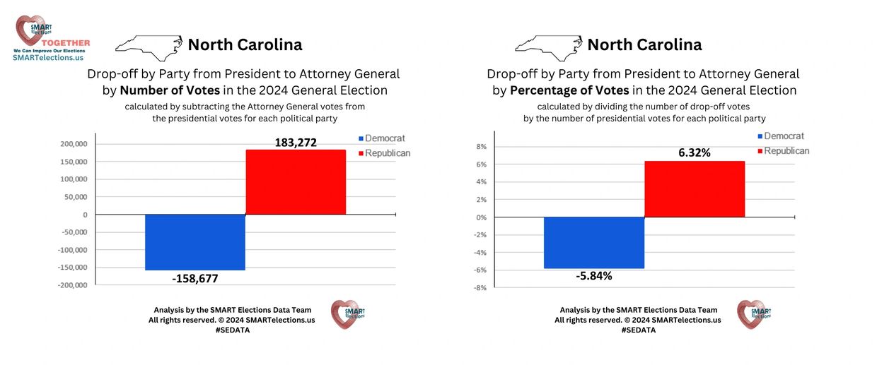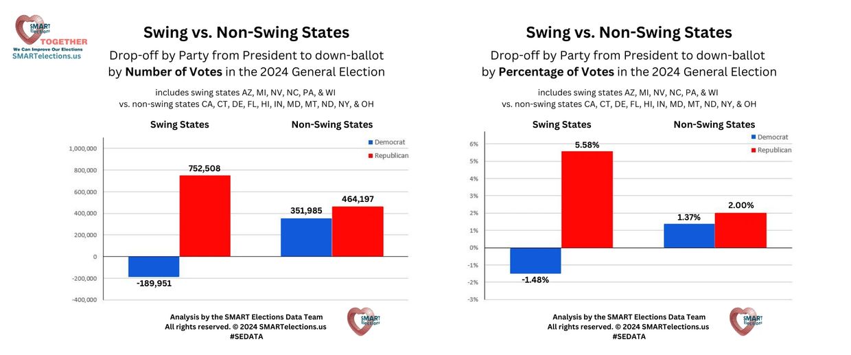 WHAT IS DROP-OFF? Drop-off is not a formal term, as far as we know. It is term that SMART Elections coined for use in the 2024 election cycle to refer to the difference between the votes for the President and the next down-ballot race. For this study, we calculated the drop-off, for the 2024 presidential election, both in raw numbers and in percentages for each major party (Democratic and Republican) for 17 states.